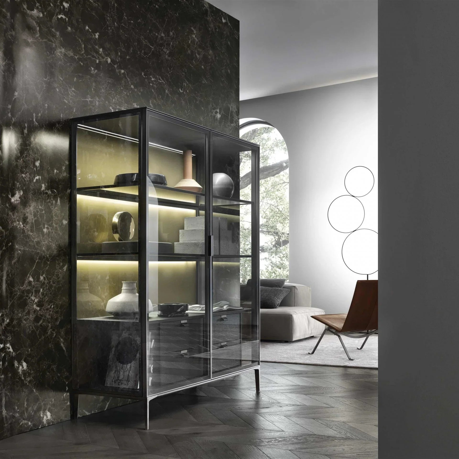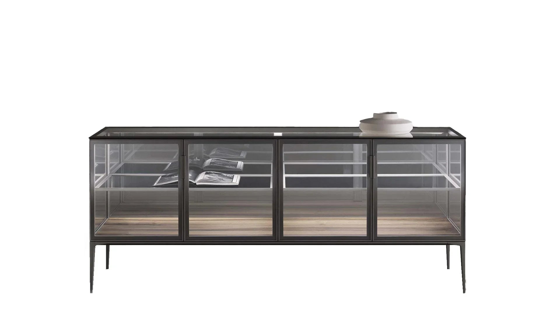 The ALAMBRA display cabinet captivates with its elegant aluminum construction and optionally available mullions. Rimadesio relies on the highest craftsmanship: precise door opening, innovative neodymium magnetic catches, and silent, adjustable rubber dampeners ensure smooth movements. Concealed fastenings and plastic connections create a seamless appearance. The result of exclusive technical development – a display cabinet that perfectly combines functionality and design.