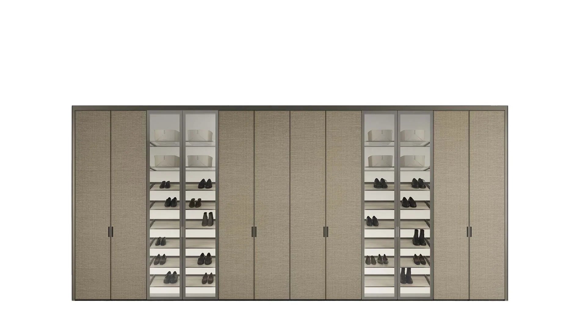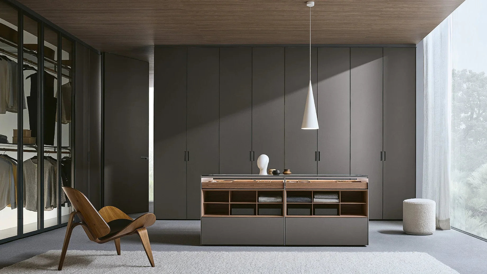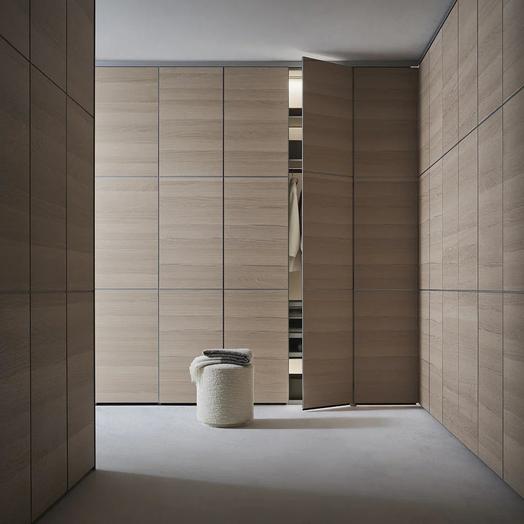 The Rimadesio COVER built-in wardrobe combines functionality and elegant design. The innovative supporting structure, fixed to both the ceiling and the floor, allows for seamless integration of invisible hinges and is perfectly complemented by the exclusive internal LED lighting system. With a wide range of fittings, including bases, shelves, hanging rails, and drawer units, the Cover system offers an optimal solution for individual room designs. Thanks to the plug-in system with no visible screws, the elements can be effortlessly adapted and varied, allowing your space to be restructured at any time.