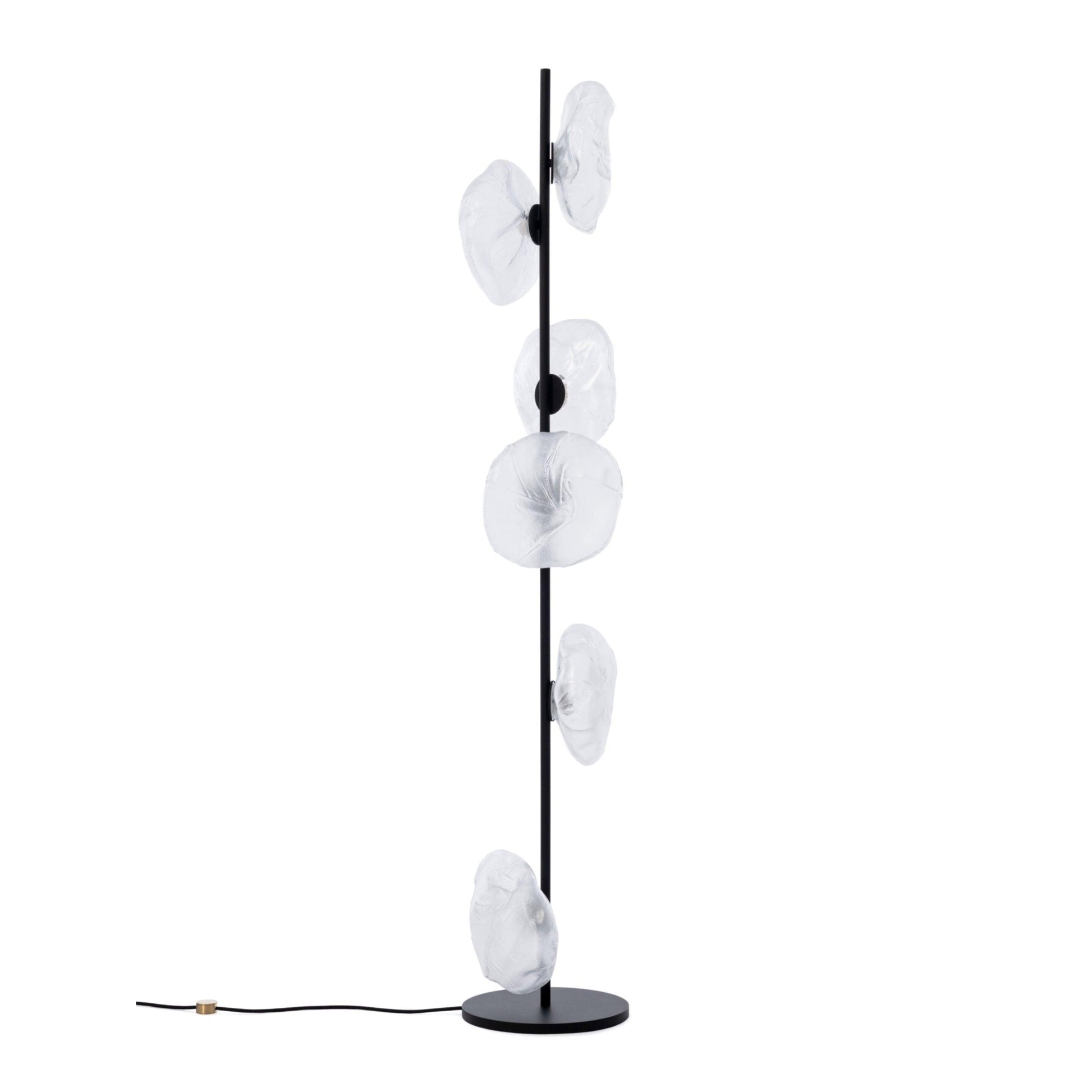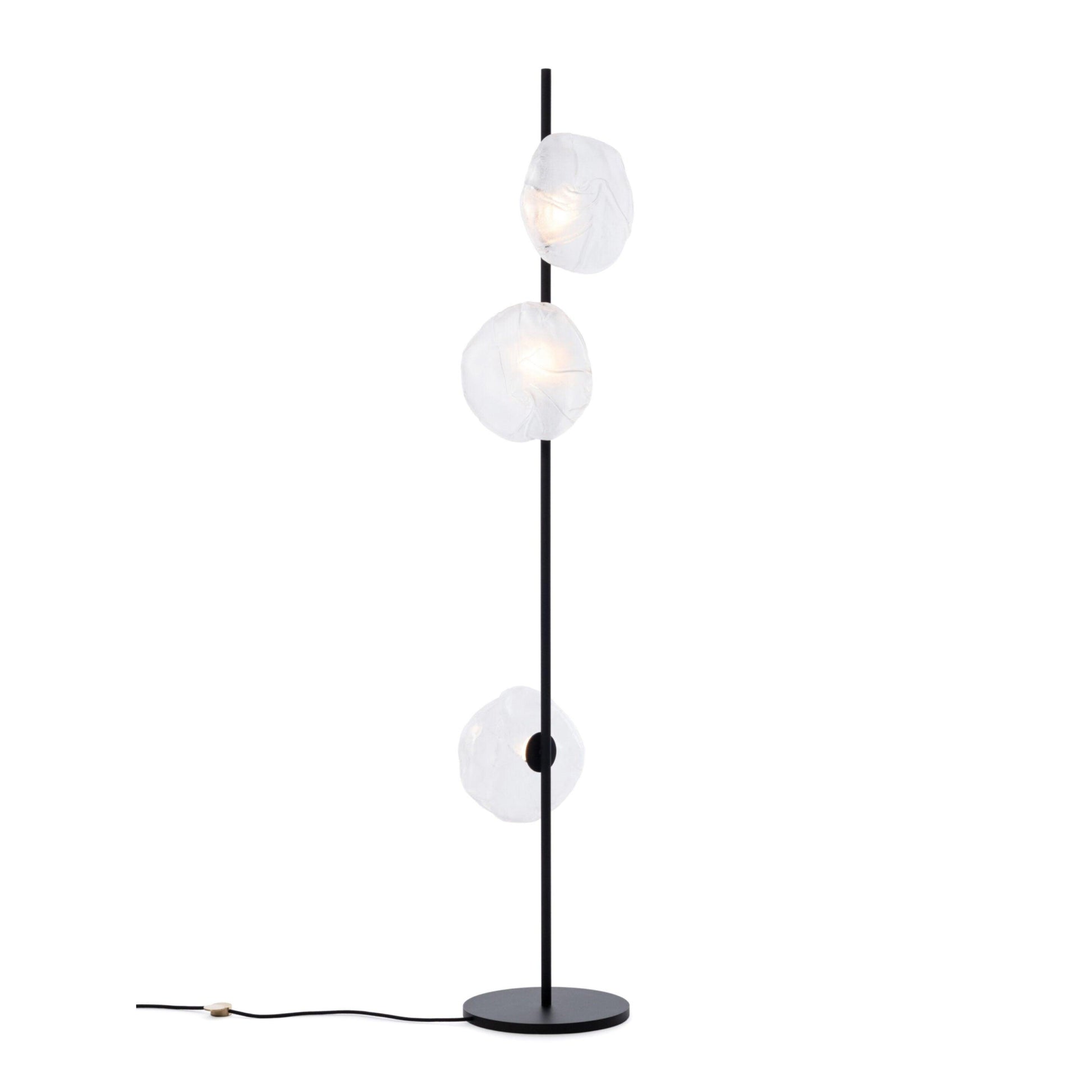 Die 73 Stehleuchte vereint modernes Design mit Funktionalität. Diese beeindruckende Leuchte besteht aus drei oder sechs mundgeblasenen Pendelleuchten, die elegant auf einem hohen Stab montiert sind. Verfügbar in einer eleganten schwarz oder in edlem Messing, bringt sie Stil in jeden Raum. Ein weiteres Merkmal ist die halbstarre schwarze Stoffschnur, mit einem patentierten 360-Grad-Dimmersystem integriert. Dieses innovative System, versteckt in einem stilvollen Messingzylinder, ermöglicht es Ihnen, die Lichtintensität nach Ihren Wünschen anzupassen.