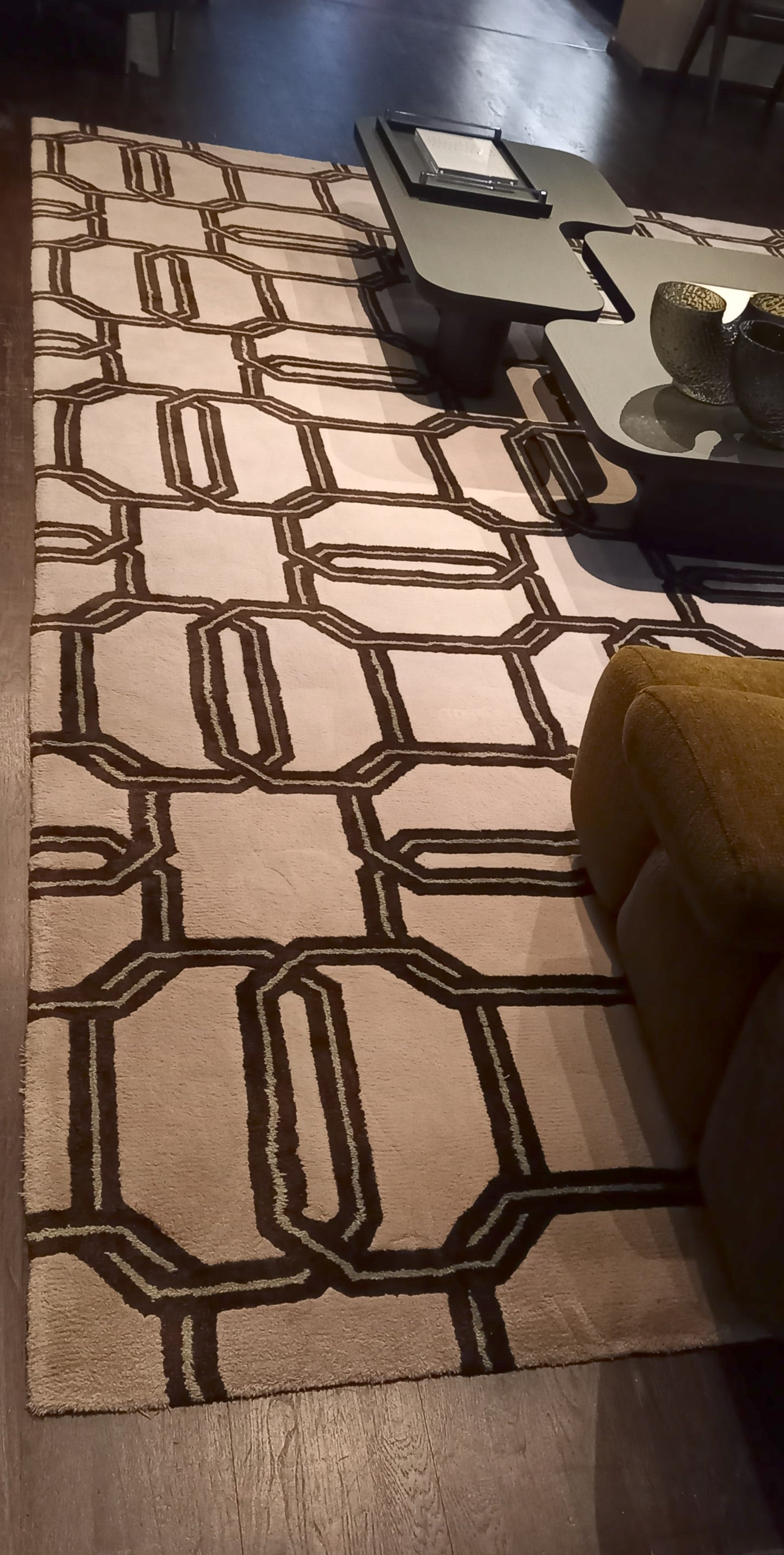 Dieser Teppich besticht durch seine durchdachte Gestaltung und solide Handwerkskunst. Die charakteristische Ringmusterung schafft visuelle Tiefe und passt sich flexibel verschiedenen Einrichtungsstilen an. Als funktionales Gestaltungselement wertet er jeden Wohnbereich auf und trägt zu einer angenehmen Raumatmosphäre bei.