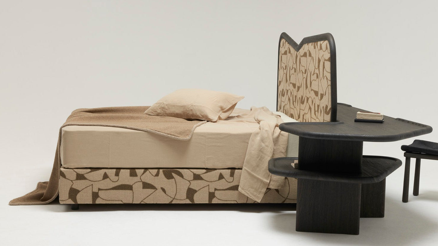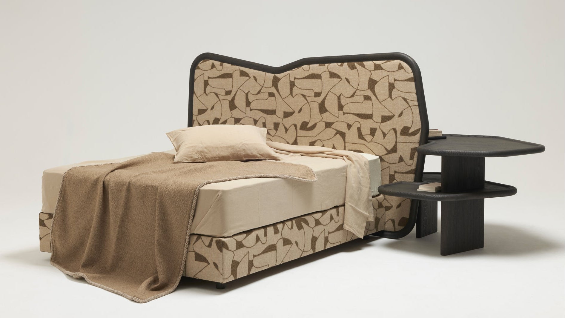 Das Bettgestell des IBO Bettes besteht aus Holz, wobei Eiche und gebürstete Eiche die primären Materialien für die Basis sind. Die Polsterung kann individuell aus einer Auswahl an Stoffen gewählt werden.