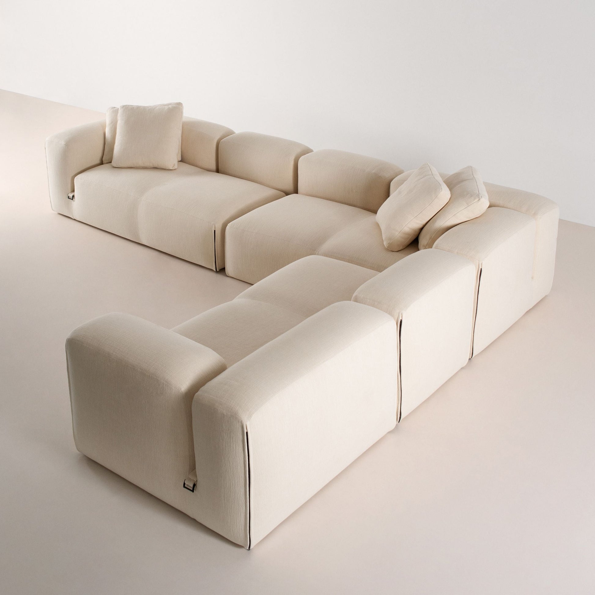 Der Bezug ist abnehmbar und in einer Vielzahl von Stoff- oder Ledervarianten erhältlich. Die einzelnen Module werden durch ein Schnallensystem und Metallscharniere verbunden, was die Modularität und einfache Handhabung unterstreicht. Das System umfasst verschiedene Elemente wie Eckmodule, Chaiselongues und verschiedene Sofamodule, die eine individuelle Gestaltung ermöglichen.