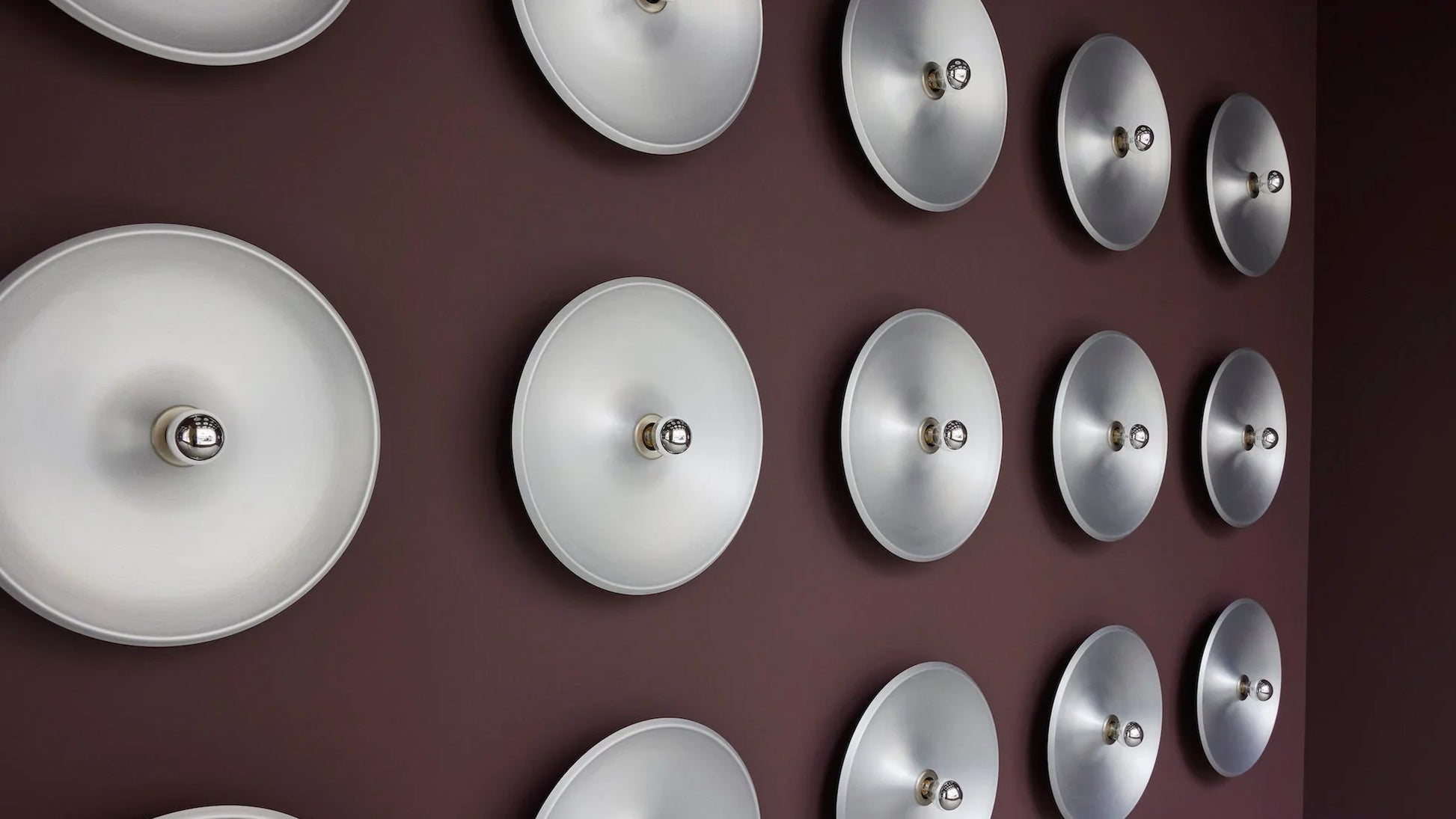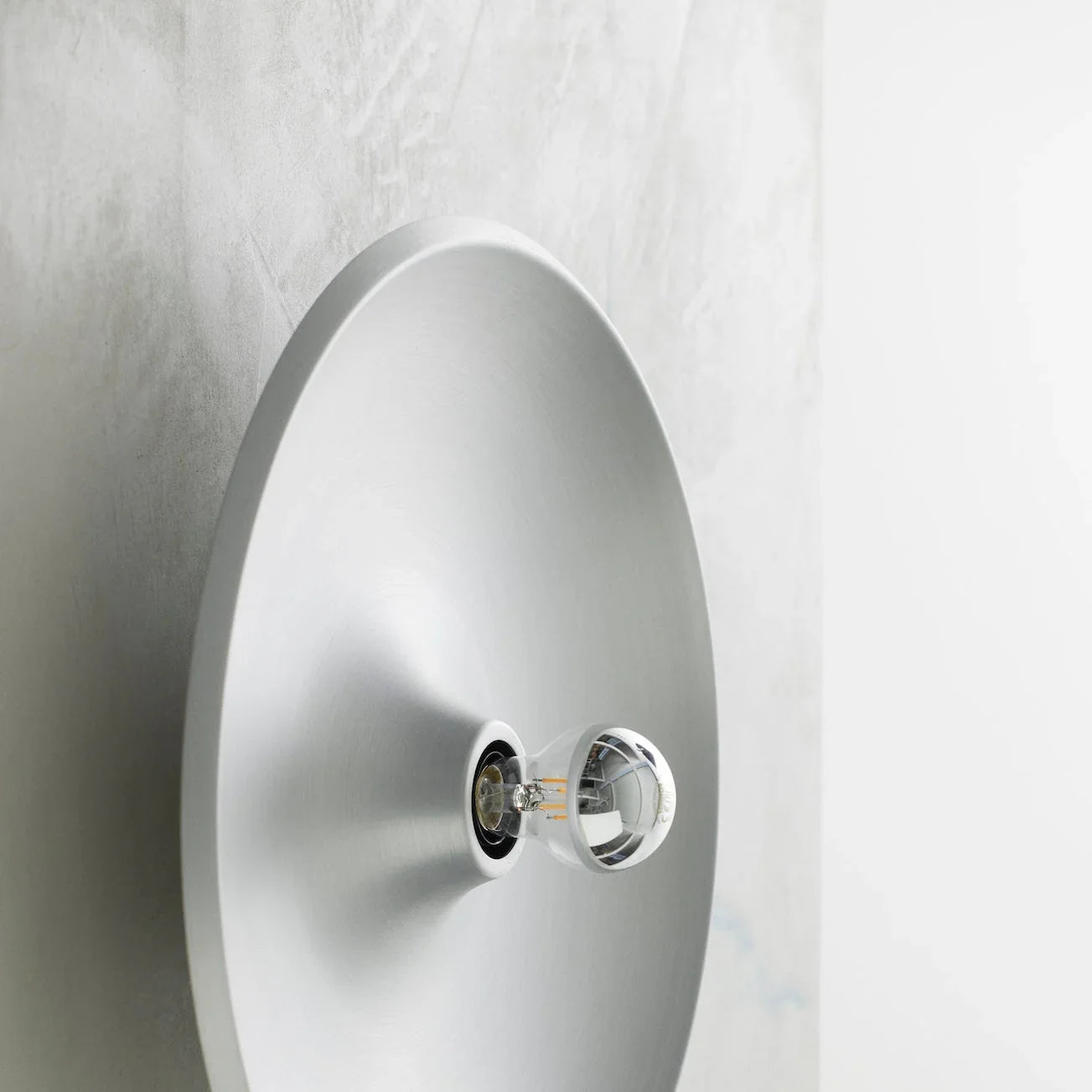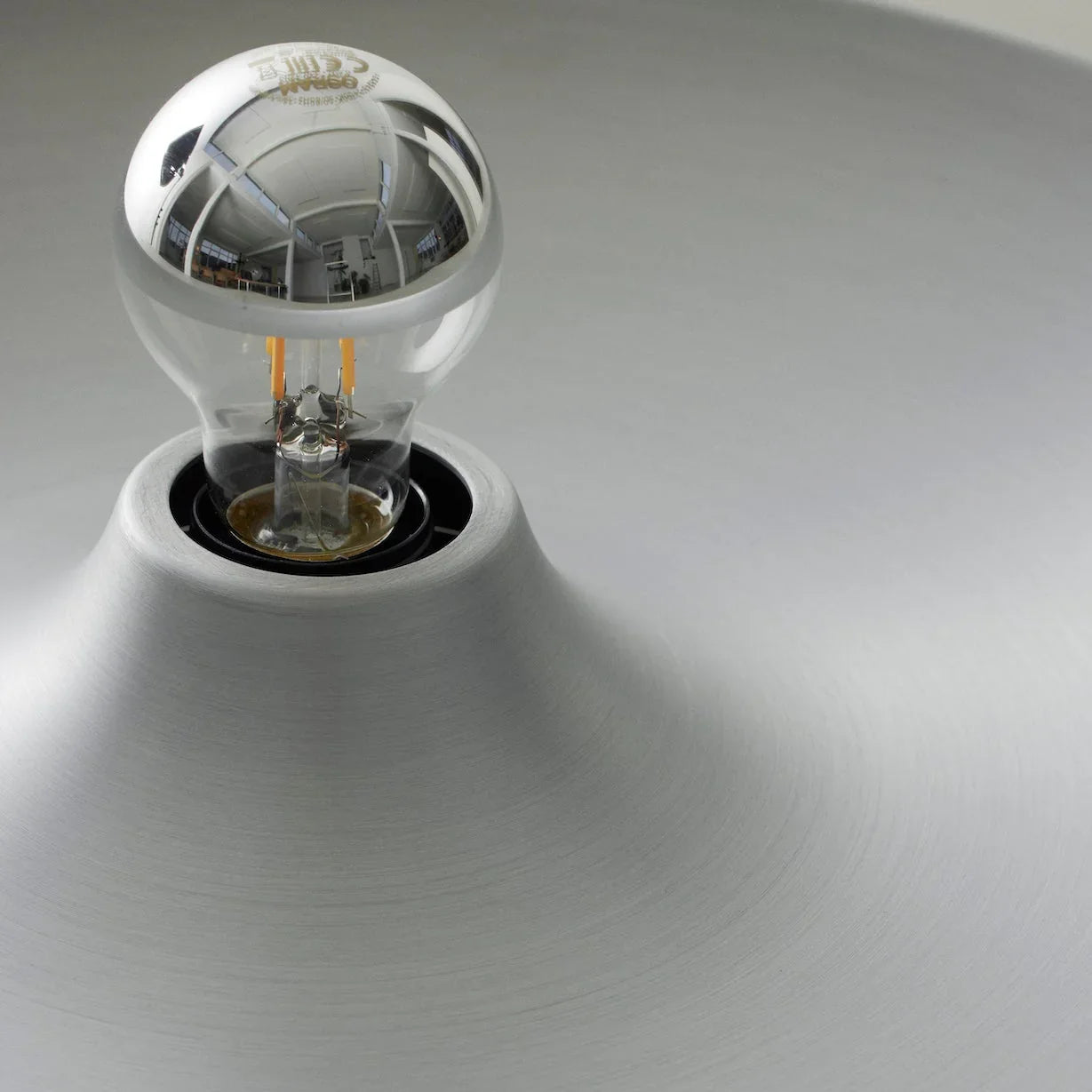 Die Leuchte besteht hauptsächlich aus satiniertem Aluminium. Dieses Material verleiht ihr ein schlichtes, industrielles Aussehen und reflektiert Sarfattis Fokus auf authentische Materialien.