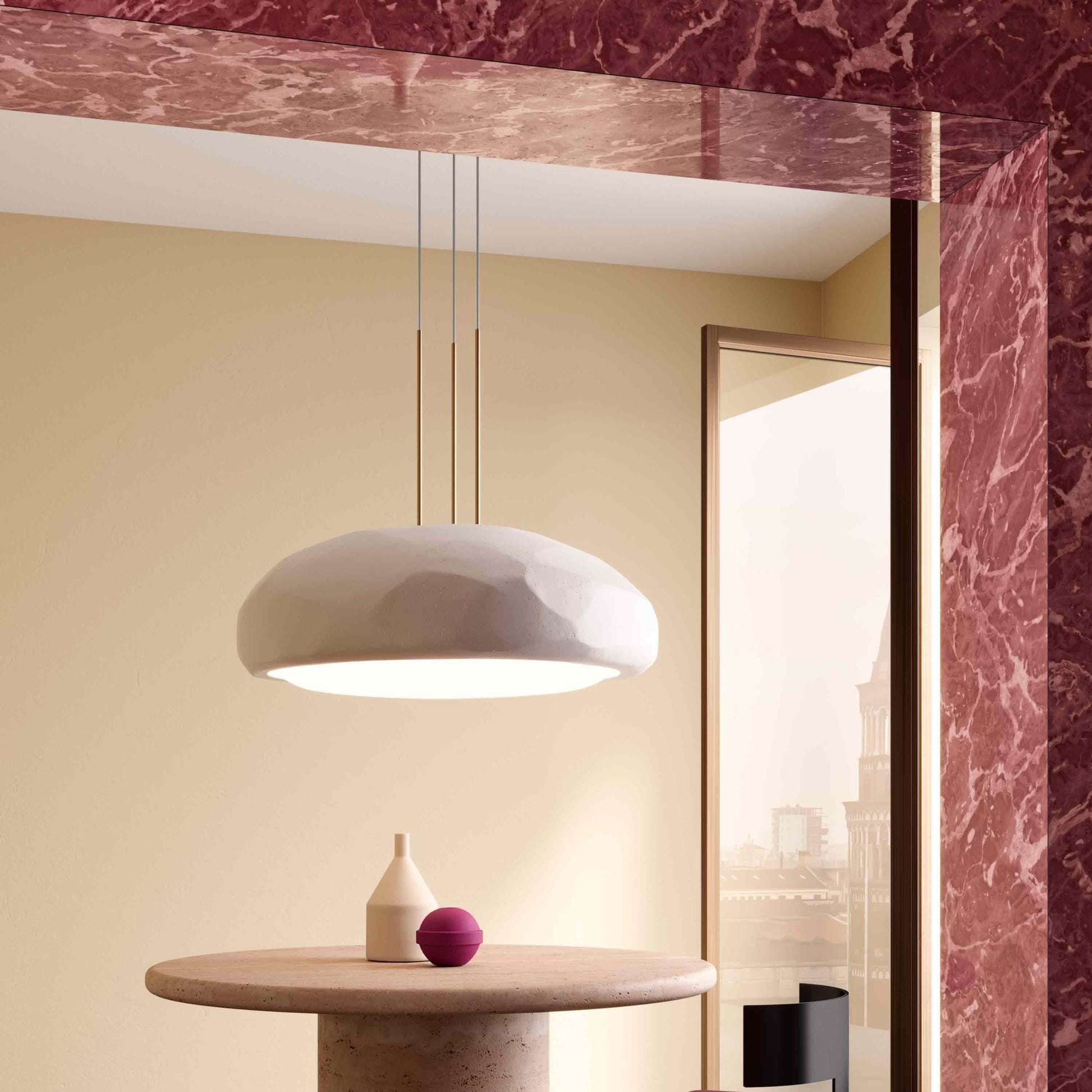 Der Hauptkörper besteht aus handgefertigtem Fiberglas (Glasfaser) mit einer Marmorstaub-Finish. Für die Lichtöffnungen wird thermogeformtes Glas verwendet, das mit einer handgemachten „Battuto“-Oberfläche versehen ist. Bei der Aufhängung kann zwischen weißem und schwarzem Kabel gewählt werden.