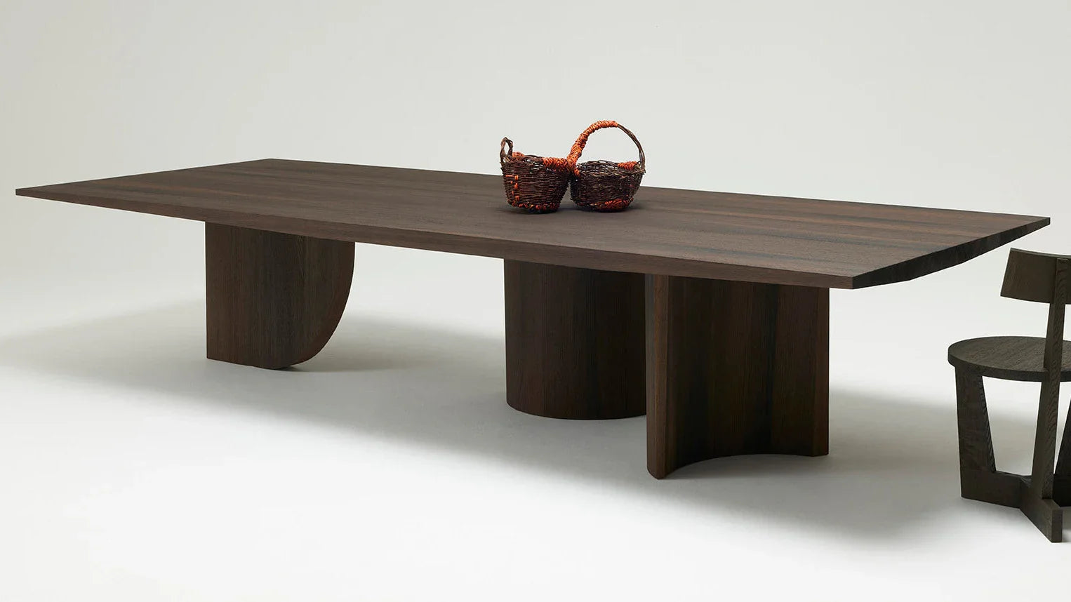 Der Tisch wird vollständig aus massiver Ulme oder massiver Eiche gefertigt. In runder oder eckiger Form erhältlich.