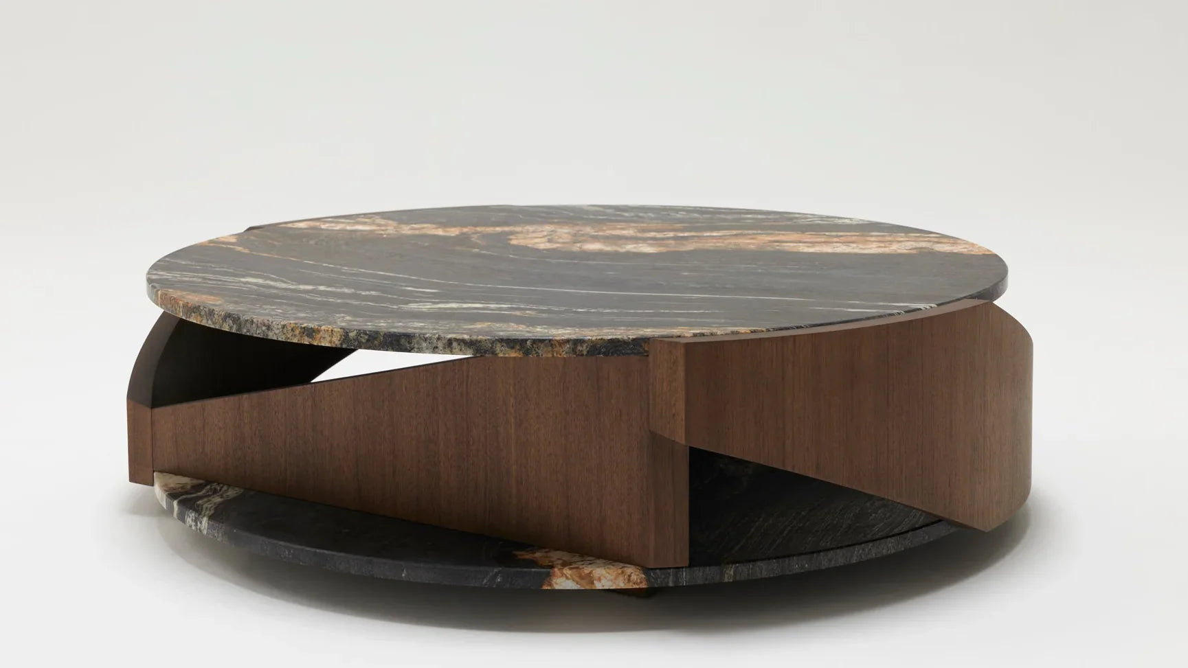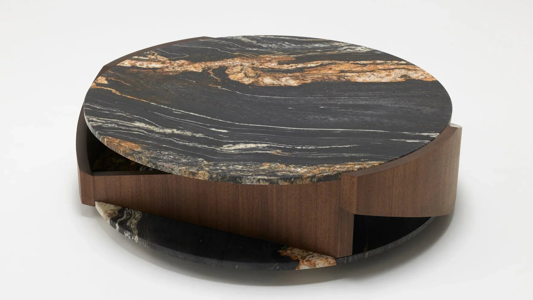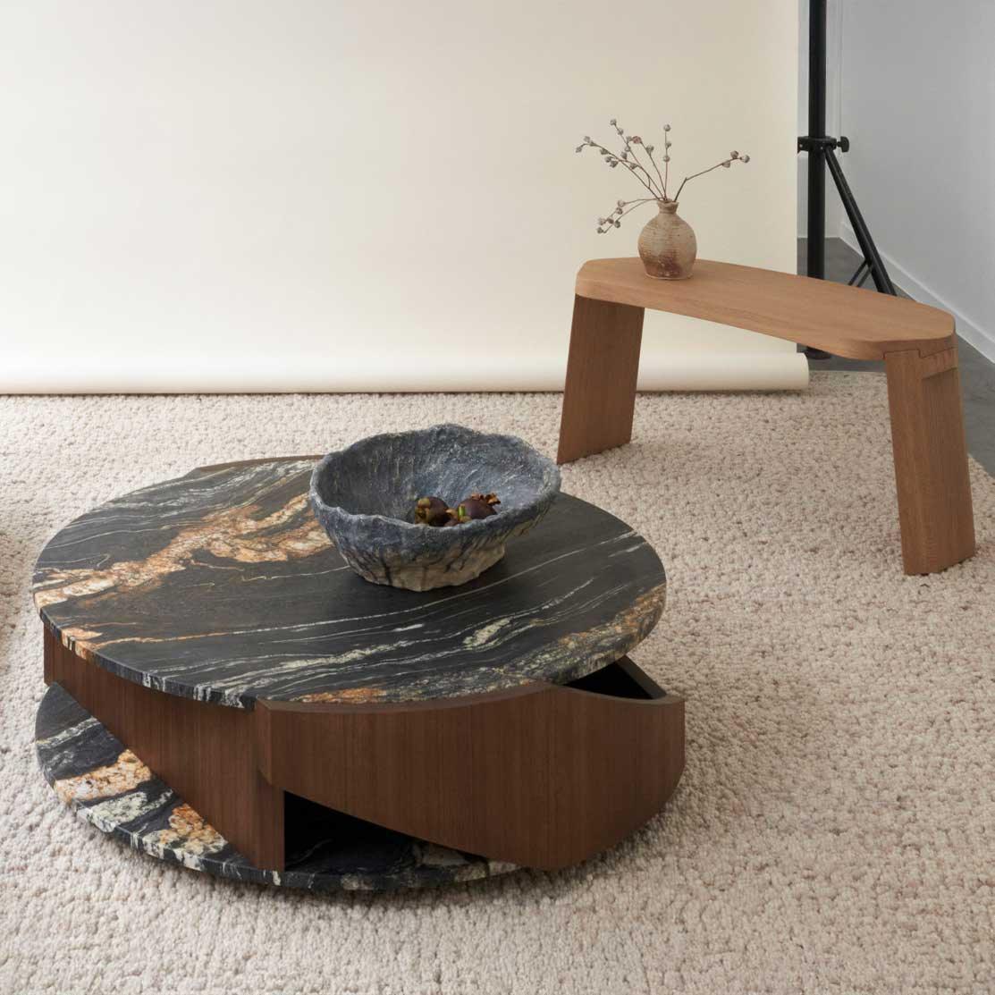 Der Tisch ist in gebürsteten Eichenholz-, gebürsteten geräucherten Eichenholz- oder Walnusstönen erhältlich. Eine optionale Tischplatte aus Marmor ist ebenfalls verfügbar.