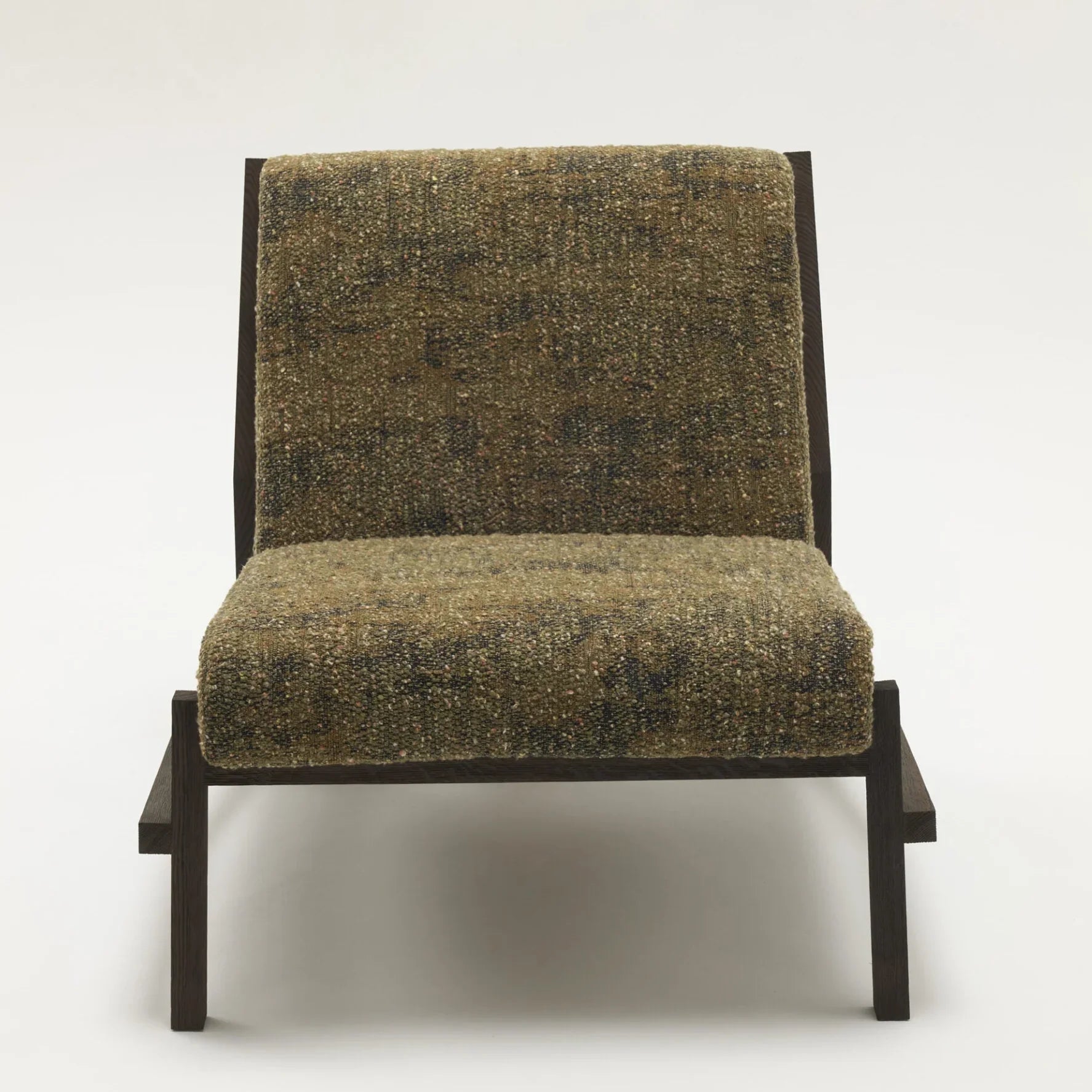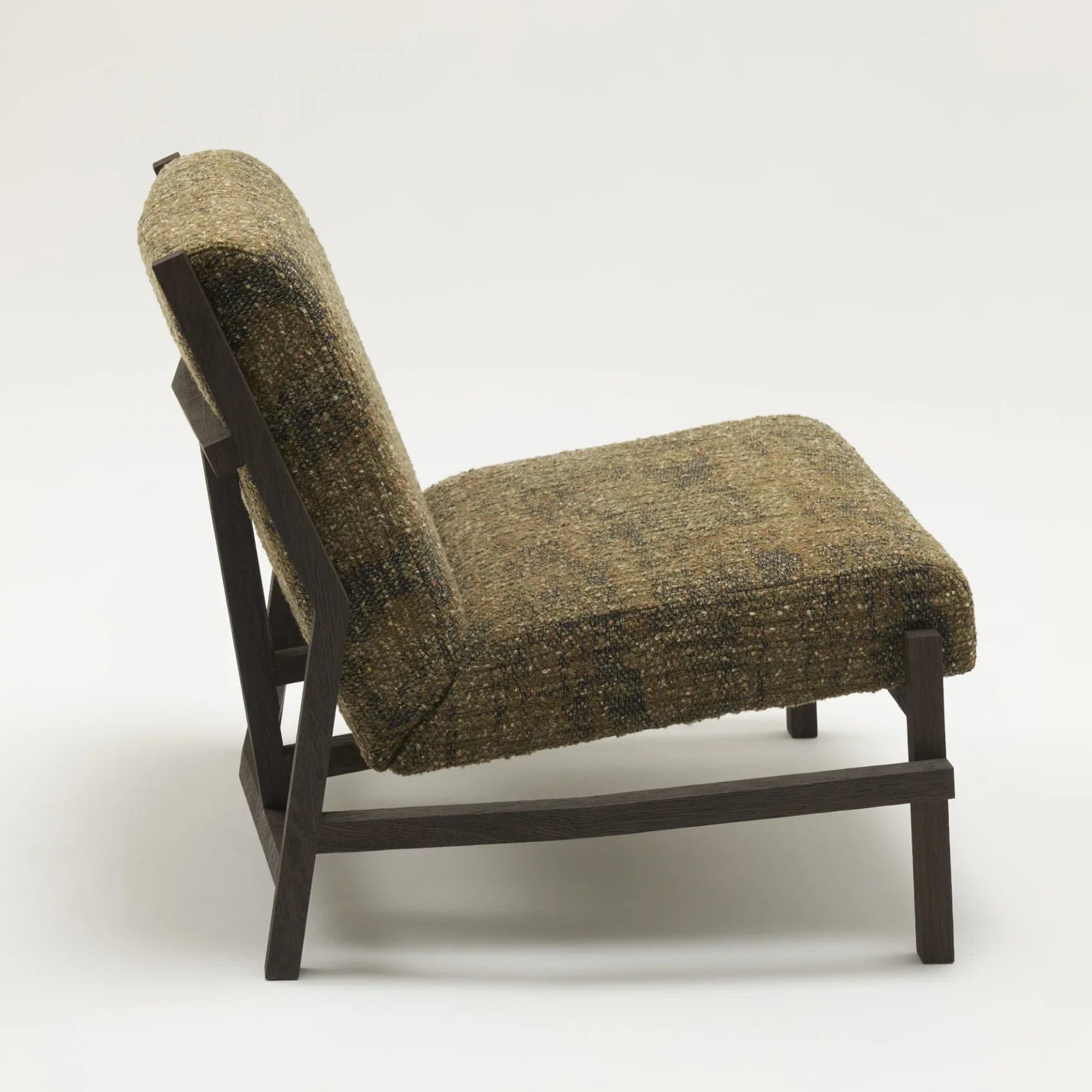 Der Sessel besitzt eine sichtbare Holzstruktur, die aus gleich großen Holzquerschnitten gefertigt ist. Das Gestell ist in gebürsteter Eiche, gebürsteter geräucherter Eiche sowie weiteren Holzarten auf Anfrage erhältlich.